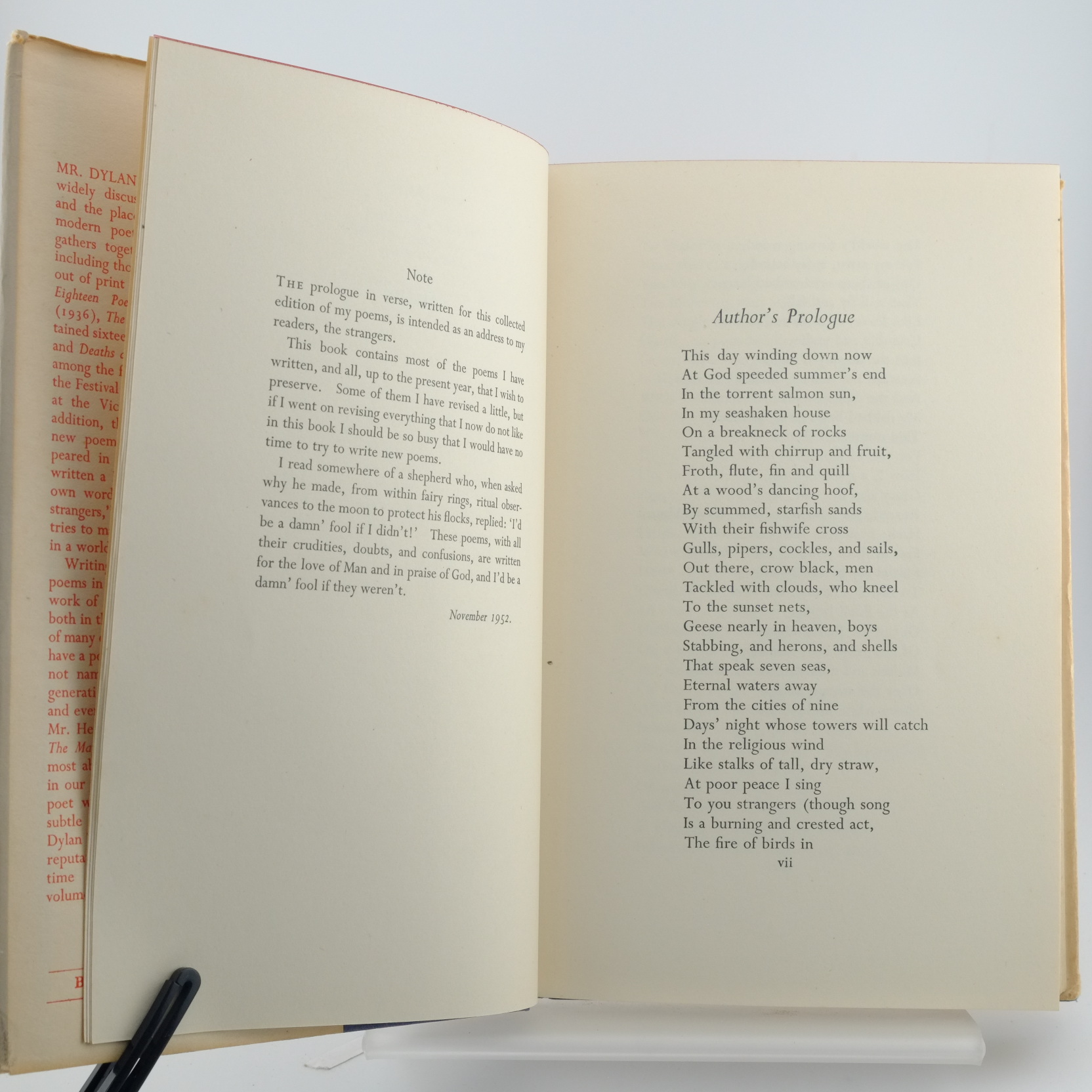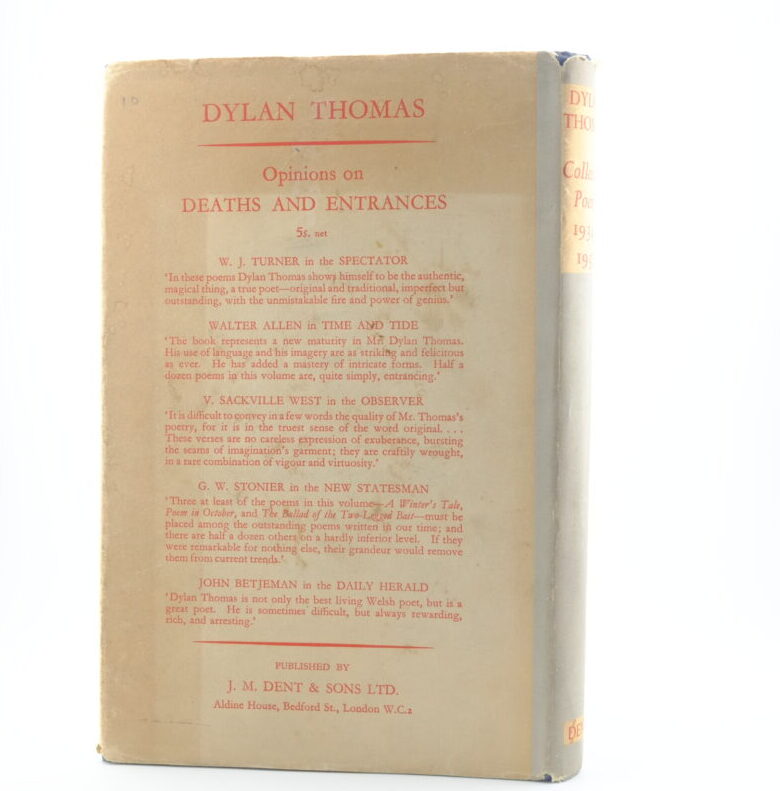 A first edition of Collected Poems by Dylan Thomas with dust jacket. A collection of all his published poems including those from Eighteen Poems (111934), Twenty Five Poems (1925), The Map of Love (1938) and Deaths and Entrances (1939) plus ten new poems. Original blue cloth boards with gilt lettering on the spine. Top edge red. Clean contents. The price clipped dust jacket is toned with only mild wear to the extremities. A very good condition. 8vo 178pp.