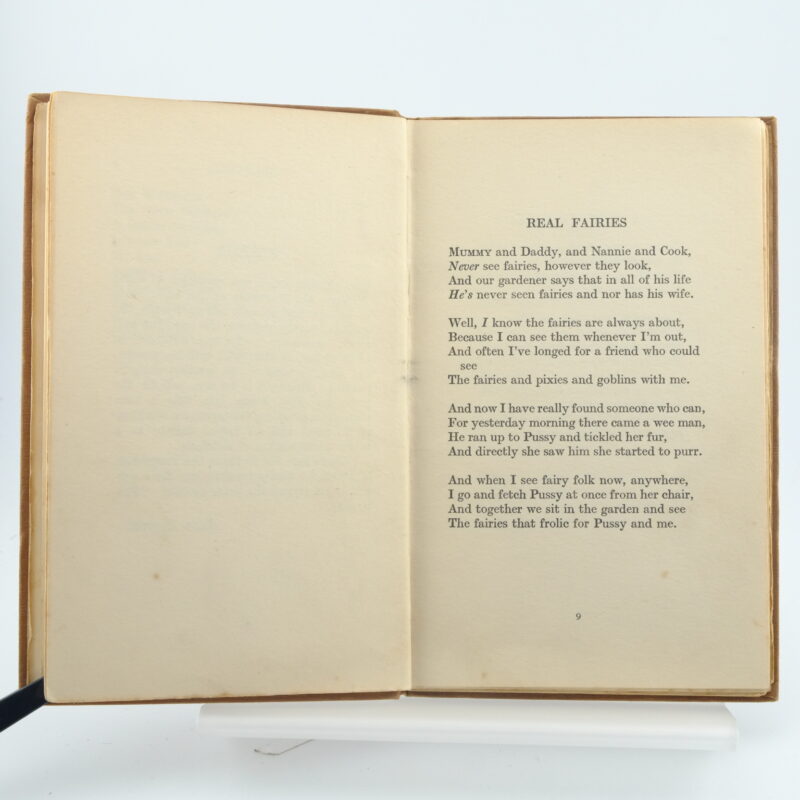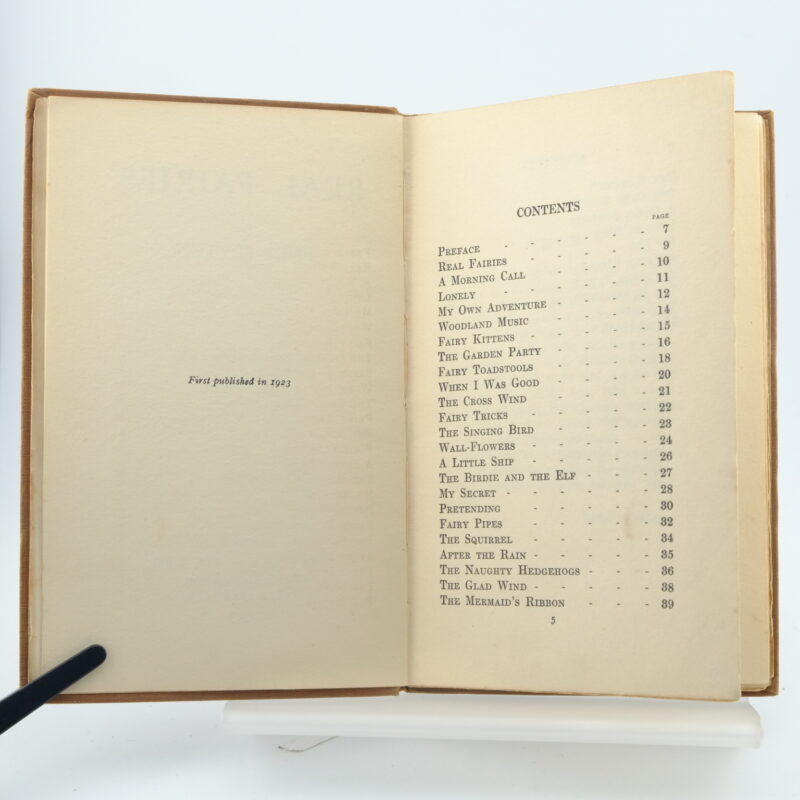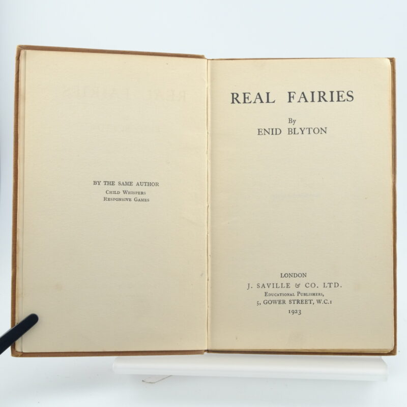 A first edition of Real Fairies containing thirty-three charming poems by Enid Blyton. Original brown cloth boards with gilt lettering on the spine and boards. Wear to the corners and spine ends. Ink dedication and a small tear on the front free page. Small dedication on the half-title page. The spine is slightly weak on page 33. A charming edition. 8vo 55pp.