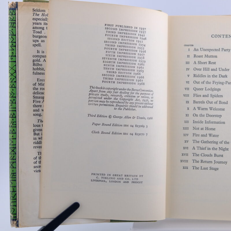 A third edition, fourth impression of the classic novel, The Hobbit. Original green cloth boards with black illustration and lettering. Faded section on the spine ends matching the dust jacket’s loss. Clean condition. The bright dust jacket has a lightly darkened spine with loss at the spine ends. Price clipped. 8vo 317pp.