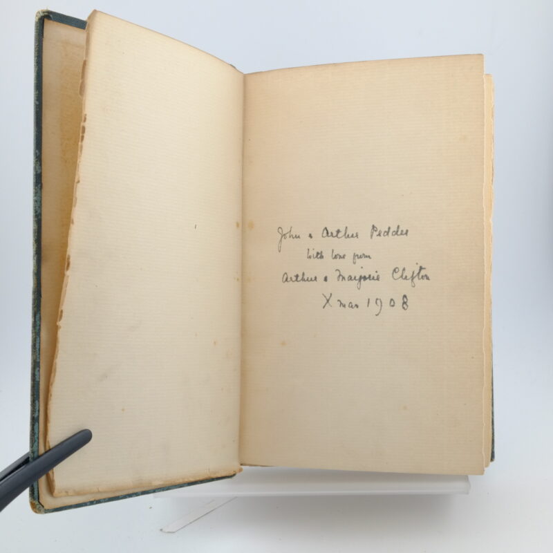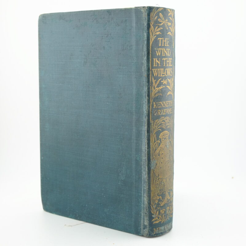 A first edition of timeless children’s novel, The Wind of the Willows by Kenneth Grahame. Original green cloth, boards elaborately decorated with gilt. Wear to the edges and the green cloth boards is mottled in places. Gilt rubbed in place. Top edge is gilt and other pages uncut. Dedication dated 1908 on the front free page. Frontispiece by Graham Robertson, with tissue guard. Circular ink stamp on the title page. Tear on the final page. 8vo 302pp.