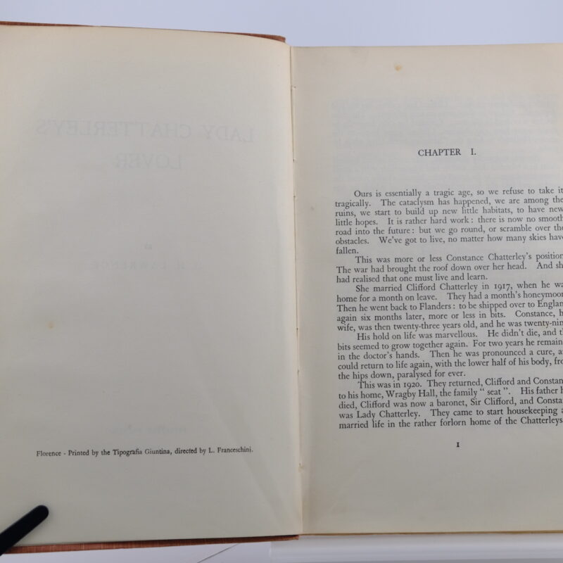 A third, limited edition of Lady Chatterley’s Lover privately printed by the historic printing house, Tipografia Guintina, in Florence, Italy. The printer, directed by L. Franceschini, handled the private, run of the controversial novel, which was largely distributed via agents in Europe and America. Brown soft, cloth covered boards in good condition. Light wear to the spine ends and corners. Fold on rear lower edge. Clean contents. 8vo 364pp.