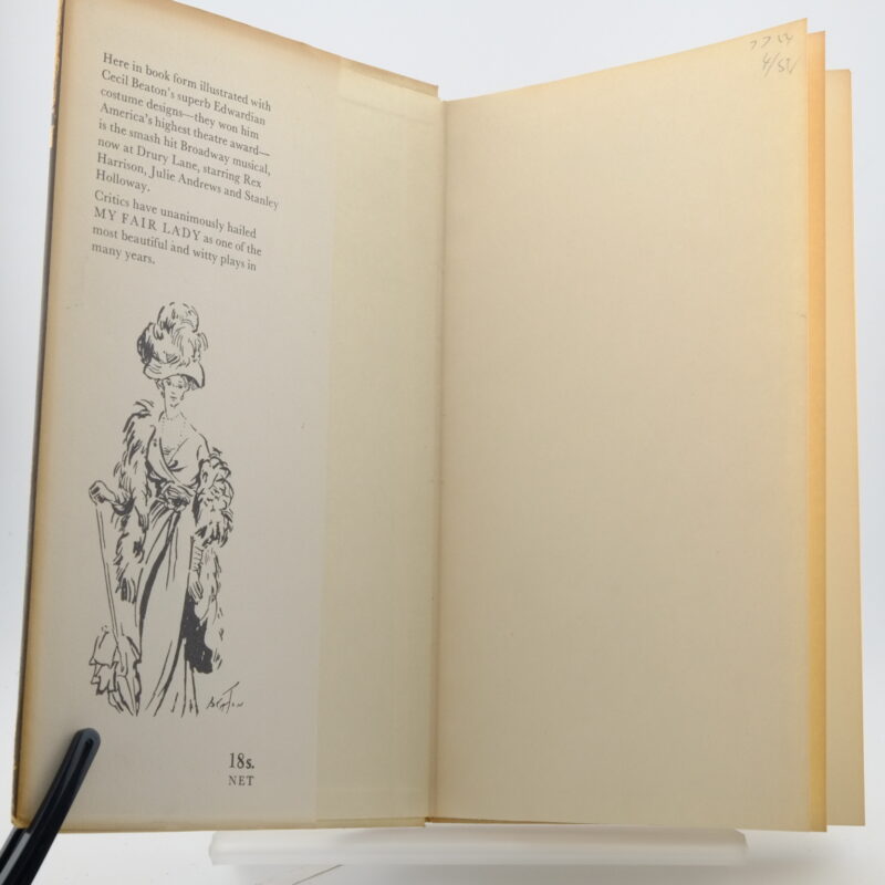 Bernard Shaw’s My Fair Lady, in book form, illustrated with Cecil Beaton’s superb Edwardian Costume designs. Complete with unclipped dust jacket. and in excellent condition. Original cream cloth boards with red illustrations. and lettering. Lightly darkened spine colour. The dust jacket has small tear and loss on the top of the spine and light chipping. A lovely copy. 8vo 156pp