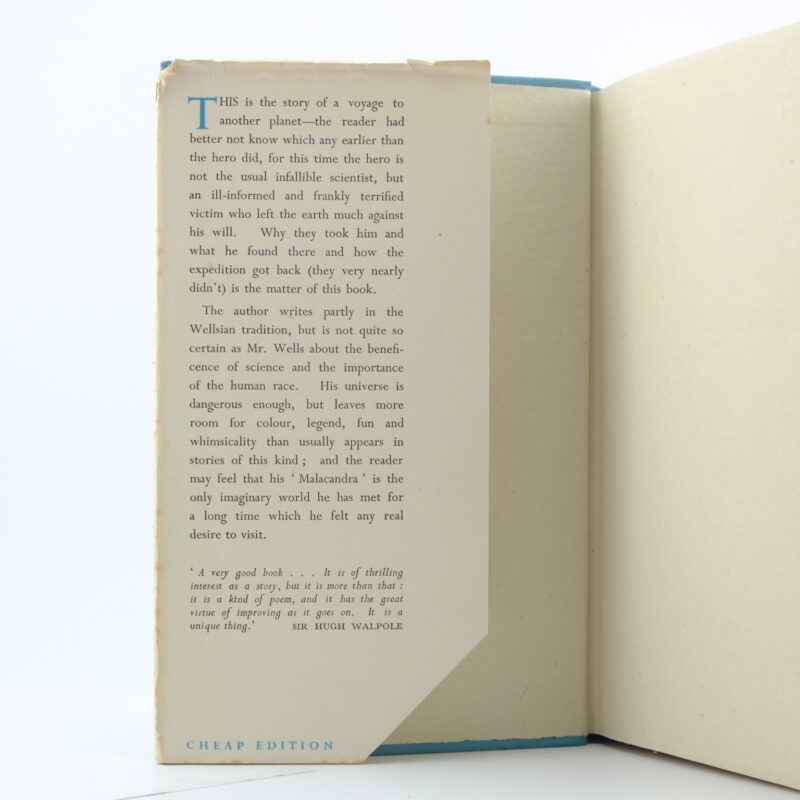 A second edition of the novel, Out of the Silent Planet, published five years after the original publication. Comes with an excellent dust jacket displaying the alternate wrapper design attributed to “Elias,” based on the original 1938 artwork. Original pale blue cloth boards in very good condition with clean contents. The price clipped dust jacket has slight loss to the top of the spine and a tear on the top edge of the front. Light chipping in a few places. Marked as “cheap edition” on the front flap. 8vo 264pp and publishers advertisements.