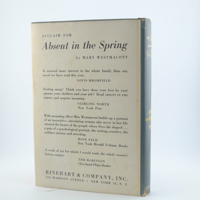 A first US edition with unclipped dust jacket of this novel by Mary Westmacott (Agatha Christie). The book was first published in the UK by William Heinemann Ltd, London in November 1948 followed quickly by this US printing by Rinehart & Company, New York, in [Nov-Dec] 1948. Original cloth boards with red and silver gilt lettering on the spine. Unclipped dust jacket with slight loss of colour on the front and edges. A lovely find. 8vo 249pp